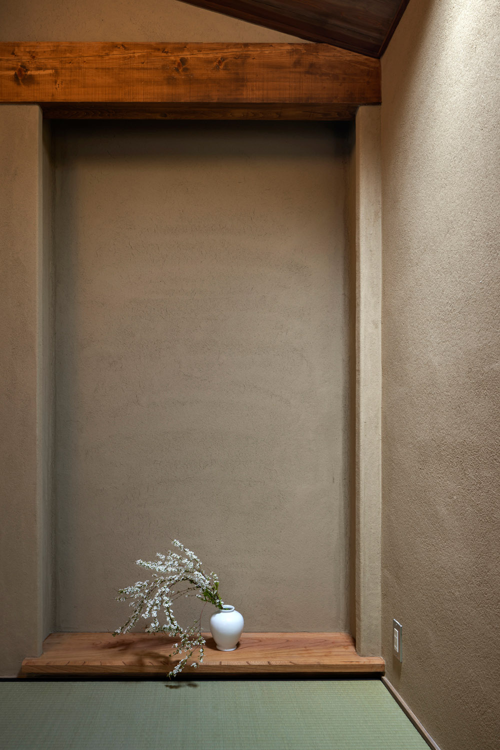 土壁土壁中塗り仕上げとした住宅の壁。ペンキやクロスにはない、落ち着いた味わいのあるテクスチャー。土壁とは土に藁や砂を混ぜて水で練ったものを塗り固めた壁のこと。